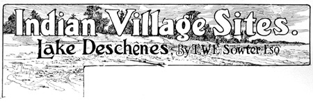 ![]() (originalement publié dans Twenty-Ninth Annual Archaeological Report, 1917, Being part of Appendix to the Report of the Minister of Education, Ontario. pp.78-85.) Big and Little Sand Points, on the west limit of Constance, or Sand Bay, on the south shore of Lake Deschênes in the township of Torbolton, Carleton County, Ontario, and the sandy beach, on the east side of Black Bay, running northward from McCook's wharf, in the township of Eardley, Ottawa County, Quebec, seem to have been important gathering places of the Indians, for many years before the advent of Europeans. Even within the memory of some of the older people, now living in the neighbourhood, Big Sand Point was occupied every summer by camps of Indians, of various Iroquois tribes, who had traditions of their forefathers having made a camping ground of this place during the French régime. Big Sand Point A long, narrow spit of sand running about one hundred and fifty yards out into the lake, at low water, and lying within the angle formed by the western shore of Constance Bay and the south shore of the main river, and behind this, above high-water mark, a large dune of more or less drifting sand, that maintains its height, north-westerly, in a considerable ridge or hog's-back, for about two hundred yards along the river front, until it lowers away into the moderately high sandy banksof the lake-such is Big Sand Point. On a former visit to this place, in 1912, my son-Edwin Sowter-now of the 38th Batt. Royal Ottawas-discovered an Indian fire-place, containing fragments of pottery, on the sand dune facing the main river, about fifty yards from the easterly end of the ridge. This turned out to be one of the outlying fire-places of a prehistoric Indian village. In 1914, in company with my son Tom, I again camped at this point. Nothing was found on the bay side, but along the river, or lake front, for about a quarter of a mile, we collected a considerable quantity of broken pottery, broken flint, a few arrowheads, musket and pistol flints, a badly rusted knife, apparently of French make, some trade bullets, and a couple of pieces of badly corroded iron or steel, each resembling a toy tobacco pipe with a straight stem about two inches in length with an egg-shaped bowl bent away from the stem at an angle of forty-five degrees, or, a quarter note in music, with a very thick stem to it. I find that these pieces of metal are of about the same size and shape as parts of the hand and wrist guards of an old sword in my possession-an heirloom of the eighteenth century. It may be mentioned here, that some years ago, at a point