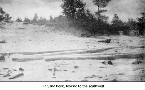 of pottery, and bones of small animals. p.80 There seemed to be a few important features about this last ash-bed which we noted with some care. We satisfied ouselves that it was above high-water mark, from observations of the shore farther up the river, where the spring floods have been washing away the banks, with their forest growth of large trees, for many years. The bed rested upon the upper surface of what appears to be pleistocen sand of unknown depth. Above this was a fifteen-inch layer of forest humus, mixed with sand, covered by five feet of clean, drift sand, which is overgrown, just at this place, with scrubby trees and a tall pine rampike. about a foot in diameter. Stumps of other trees, with roots in position, in this upper deposit of drift sand, are upwards of two feet in diameter. Upon reviewing our work in 1914. some time after our return home. it occurred to me that Indian fire-places might be found beneath the forest humus behind the sand ridge, among the pitch pines farther back from the shore. In accordance with this idea we returned in the autumn of 1915, to investigate. Some holes were made in several places without results, and our task seemed hopeless, when some tiny fragments of clam shells were observed on a hill of black ants. In the absence of a shovel, which we had neglected to bring with us, an excavation was made at the ant-hill with a crudely made digging stick and a graniteware washbasin, and, beneath some six inches of forest deposit, an ash-bed, about five feet wide and nine inches deep, was exposed. It rested immediately upon the pleistocene sand, and was a duplicate of the bed beneath the sand ridge, being a mass of ashes, clam shells, small animal bones, broken pottery and some chunks of flint. Ashes and clam shells were also found in two or three other openings made among the trees. Now, it would appear from the foregoing data, that before the forest growth, (that now covers the bluffs or Sand Hills, as they are called. within the peninsula between Constance and Buckham's Bays and the main river) had encroached upon the shore line, there was an acre or so of comparatively level sand at this point, upon which the red hunters made their camp-fires and appeased their appetites with roast clams, and other and varied bounties, which field and stream must have yielded them in great abundance, for even within the last half century, game of all sorts was plentiful hereabouts, as was fish, also, in the adjacecent waters. After a while, for some unaccountable reason, possibly one of the red, wilderness tragedies, the story of which is lost to us, this plot of sand was abandoned to the forest, which held dominion over it until there was deposited fifteen inches of vegetable matter. Then the winds began to drift the sand over the edge of the forest, apparently killing it out and forming the ridge, already described, which rises to its greatest height, at its south-eastern extremity, in what has been called the Wendigo Mound. The forest then took possession of the top of the ridge, as did, also, the Indians, whose camp-fires once more glimmered through the branches. As these late comers had not discarded their pottery, which